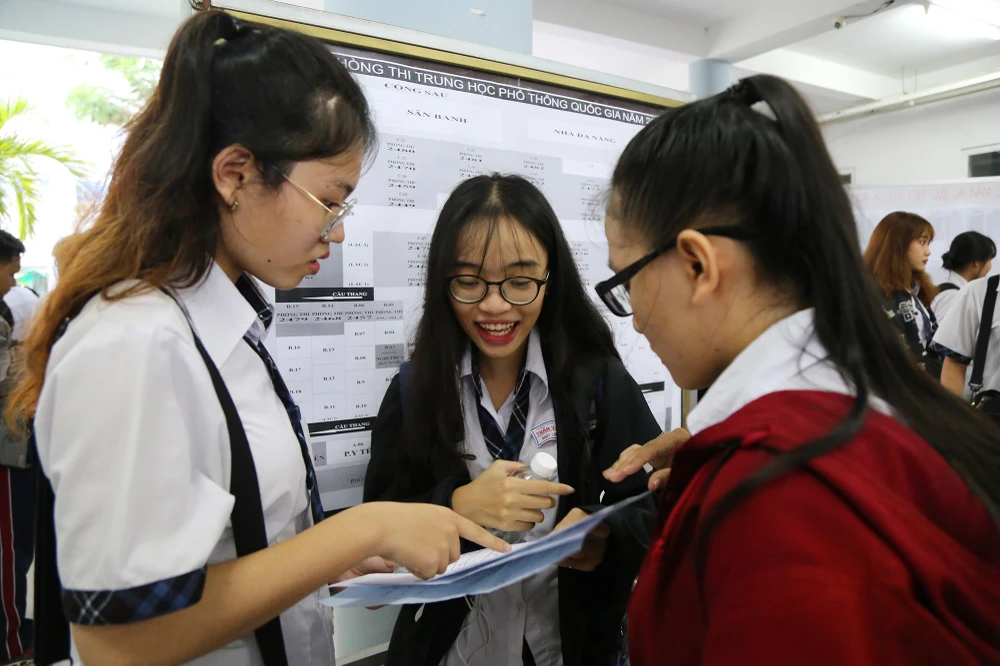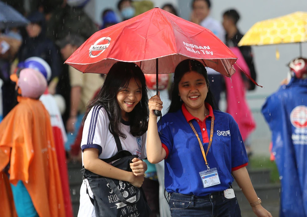 Thí sinh vui vẻ rời phòng thi giữa trời mưa.