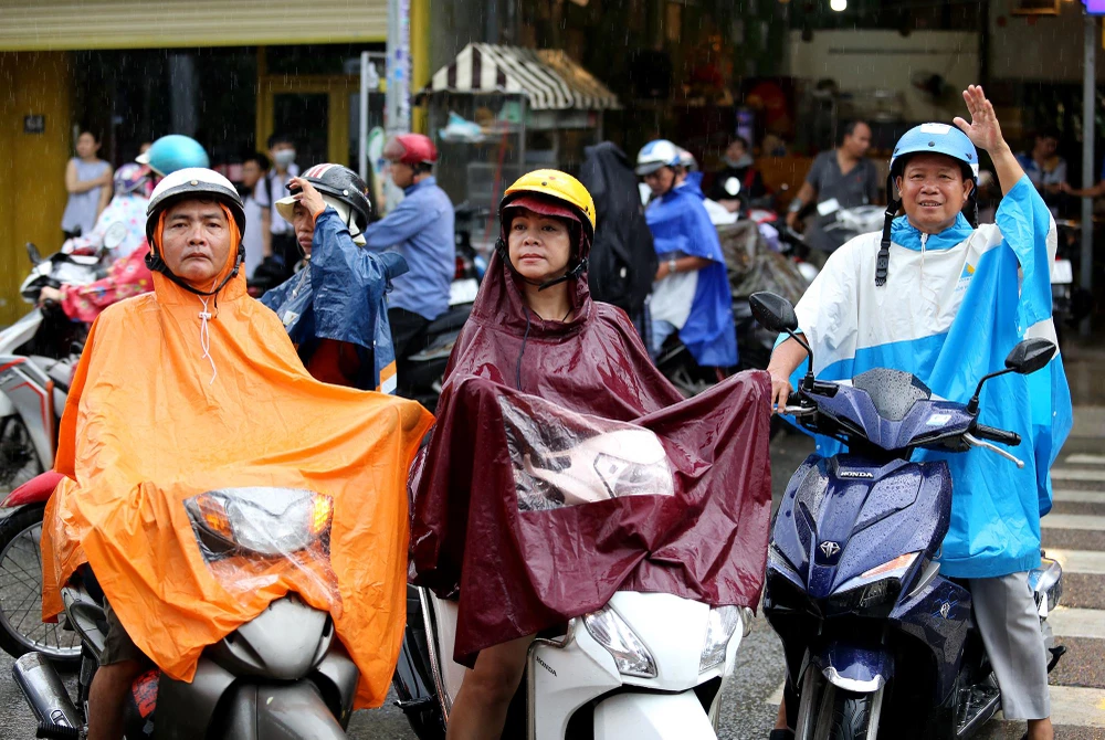 Người mẹ dùng áo mưa che cho cả 2 người con sau giờ thi.