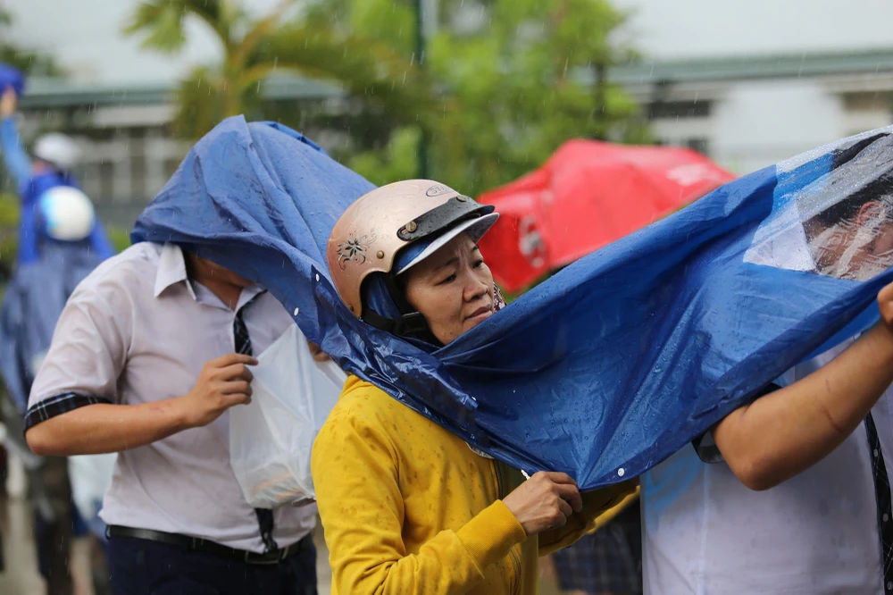 Phụ huynh mặc áo mưa cầm dù vào tận bên trong trường che mưa cho con ra khỏi phòng thi.