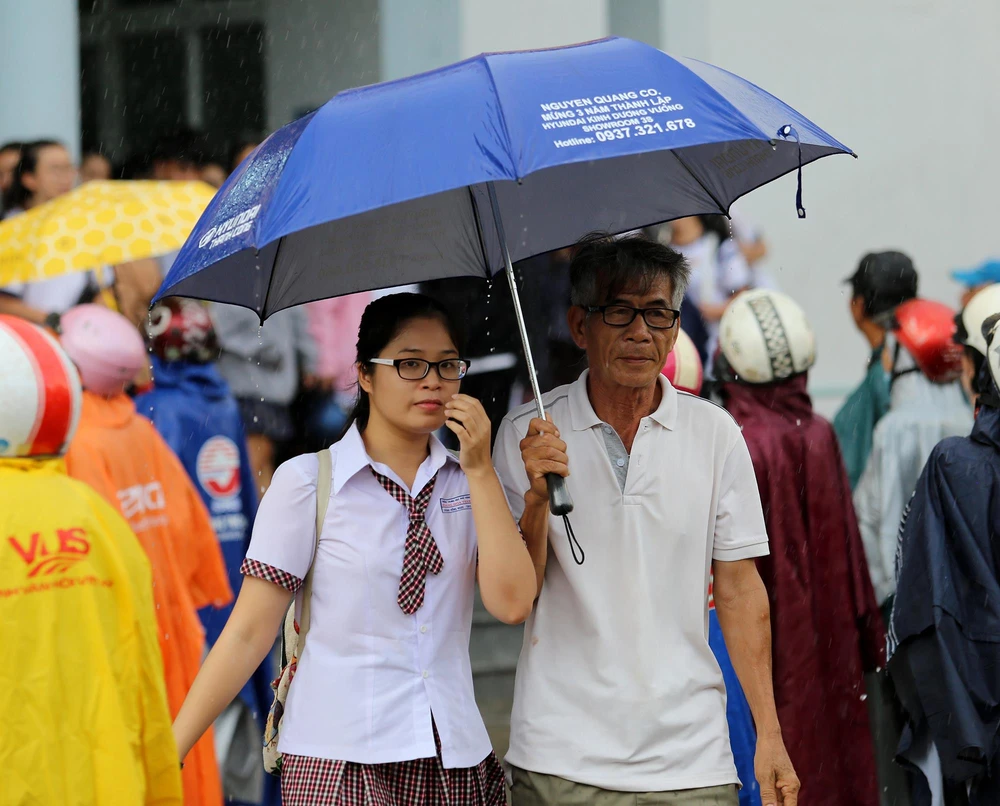 15 phút đứng dưới mưa, cuối cùng ông cũng đã chờ được con mình ra khỏi phòng thi và che cho con khỏi ướt.