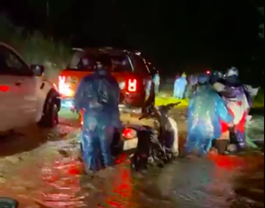 Sáng 8-10, mạng xã hội lan truyền đoạn clip ghi lại cảnh đoàn người từ các tỉnh, TP phía Nam đi xe máy về quê. Khi đi qua địa bàn huyện Nam Giang, tỉnh Quảng Nam thì gặp mưa lớn, nước chảy tràn ra đường, ngập sâu không thể di chuyển.