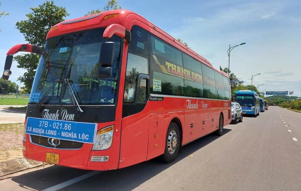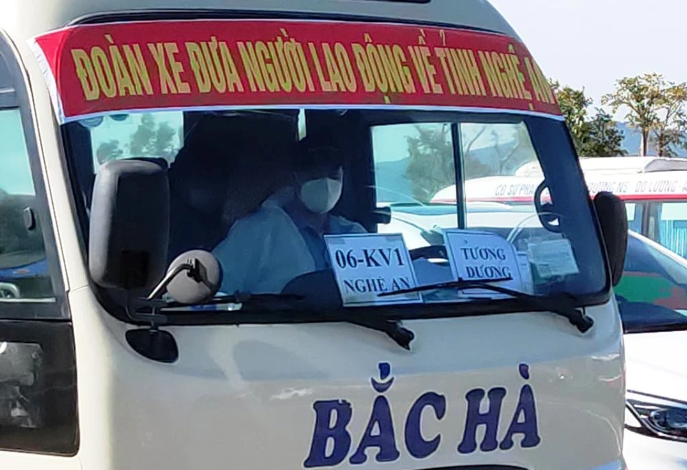 Chính quyền địa phương đưa xe khách đến thị xã Hoàng Mai (Nghệ An) để đón công nhân từ Bắc Giang về.