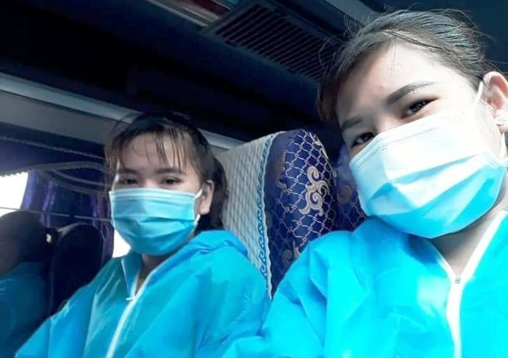 Các nữ công nhân mang đồ bảo hộ và khẩu trang suốt hành trình từ Bắc Giang về quê nhà Nghệ An.