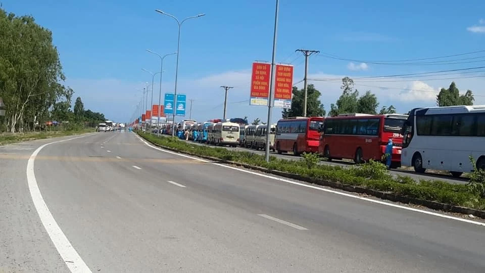 Dưới nắng nóng, gió Lào bỏng rát, từng dãy xe khách đến từ TP Vinh, thị xã Thái Hòa, thị xã Hoàng Mai, thị xã Cửa Lò và các huyện đã đỗ sẵn sàng (tại ba khu vực) để rước công nhân về quê.