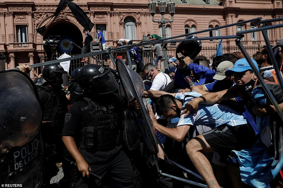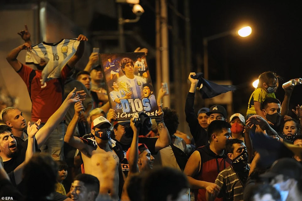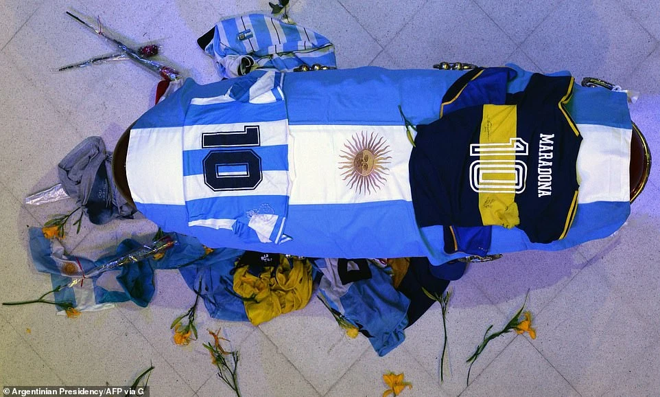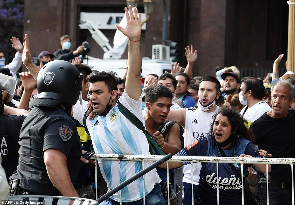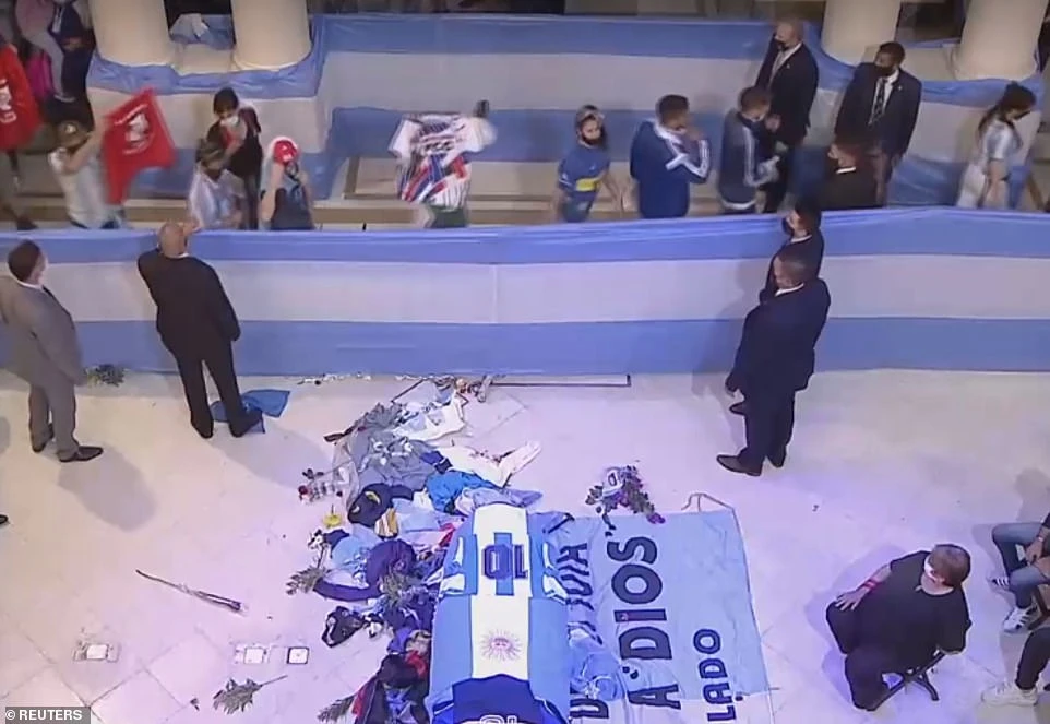 Dưới chân quan tài Maradona là hàng đống áo đấu của đội tuyển Argentina, hoa, cờ,… mà người hâm mộ để lại để bày tỏ sự tôn kính đến “Cậu bé vàng”. Đã có những cuộc đụng độ xảy ra giữa lực lượng chức năng và fan hâm mộ.