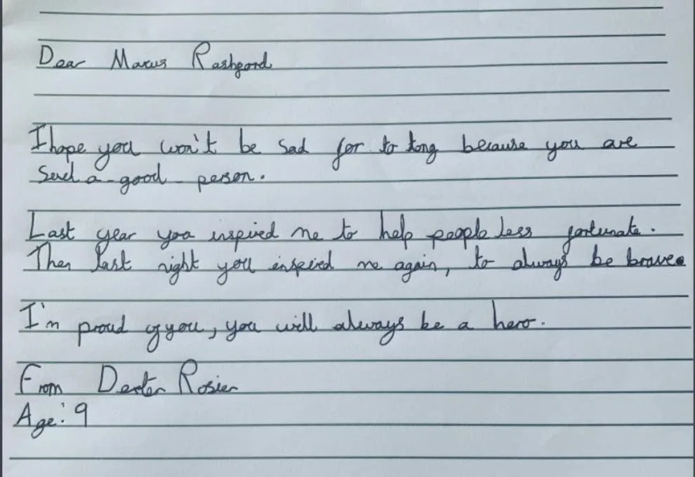 Rất nhiều thư của giới hâm mộ trẻ tuổi ca ngợi Rashford bởi sự can đảm mà anh ấy phải đối đầu và tri ân chiến dịch cung cấp bữa ăn miễn phí cho trường học, bãi bỏ tình trạng nghèo đói cho trẻ em.