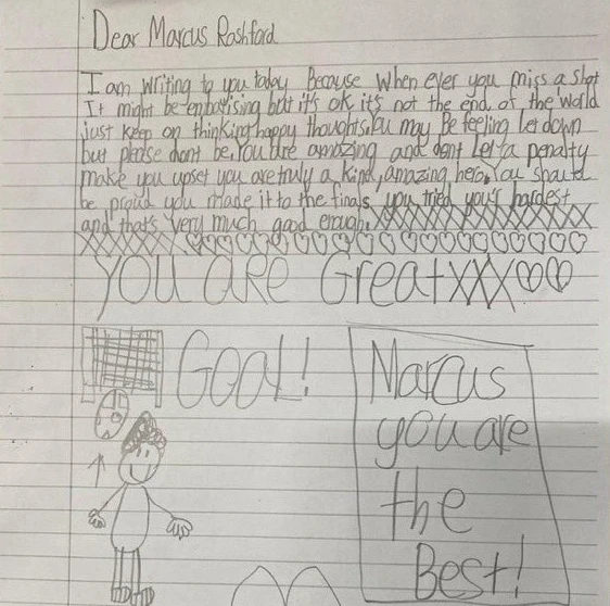Một cậu bé 6 tuổi đến từ Newcastle đã gửi lời yêu thương đến Rashford và viết: "Đừng nghe những lời khó chịu của những kẻ hay bắt nạt. Em gửi cho anh chiếc cúp của em, như lời cổ vũ đến anh”.