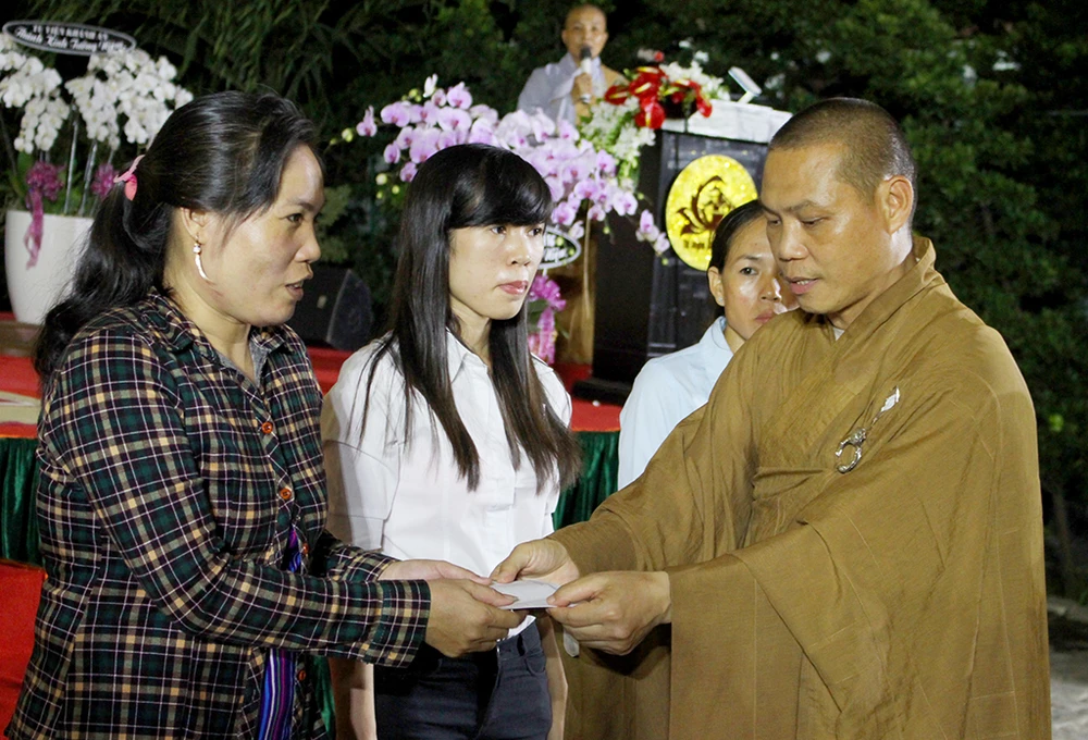 Thượng tọa Thích Trí Chơn - Trưởng ban trị sự Giáo hội Phật giáo Việt Nam quận 12 trao tiền hỗ trợ cho gia đình các nạn nhân. Ảnh: LÊ THOA