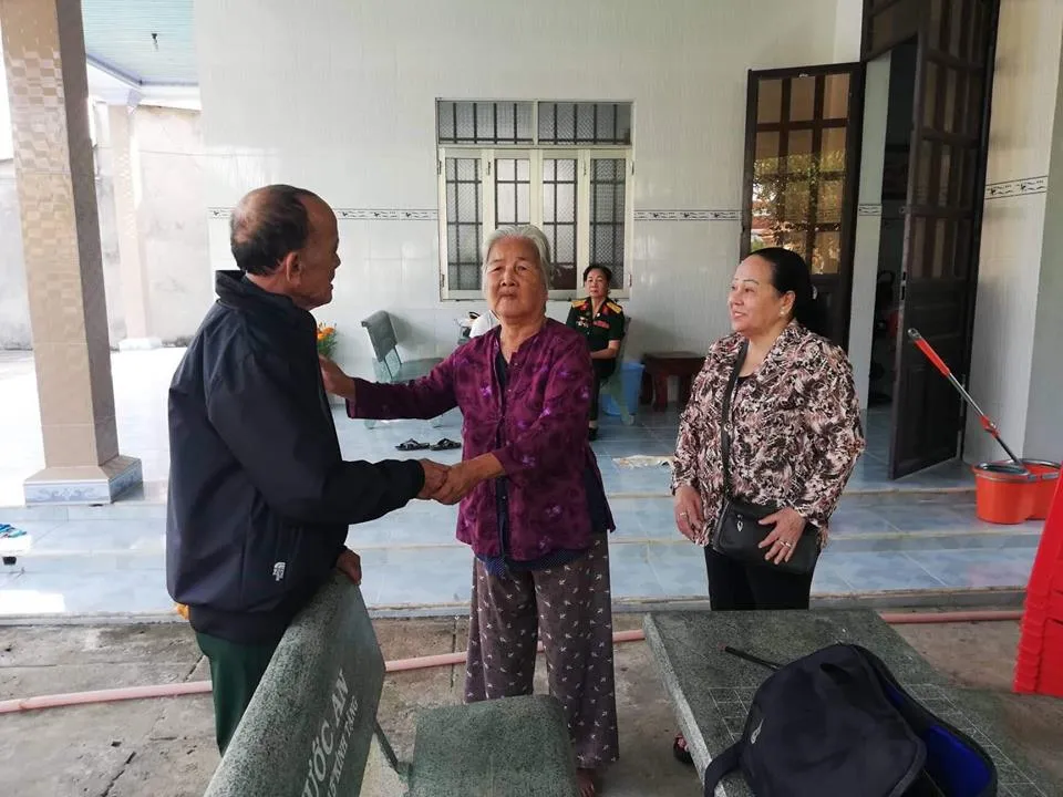 Chị Tô Thị Mai Hương (góc ngoài cùng bên phải ảnh) xúc động khi được nhắc về cha mình. Hàng năm, chị lại đón chuyến xe từ Bình Dương tìm đến nơi này để tưởng nhớ cha mình là liệt sỹ biệt động Tô Hoài Thanh. ẢNH: T.T