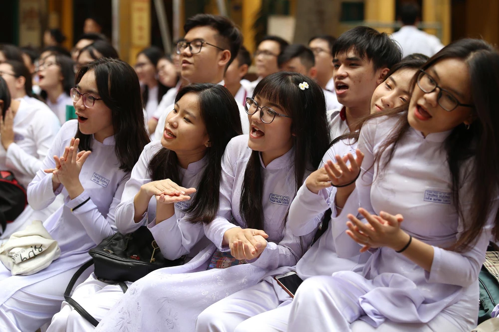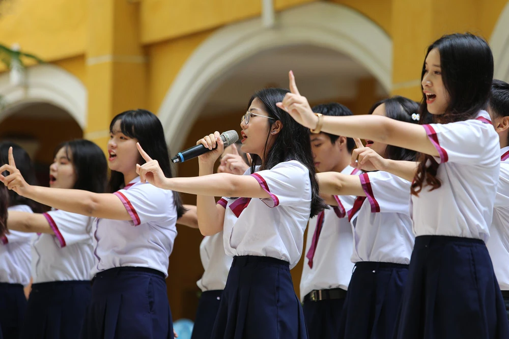 Học sinh hòa giọng vào các tiết mục tri ân thầy cô, cha mẹ trong buổi lễ.