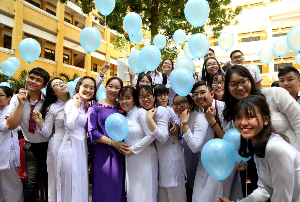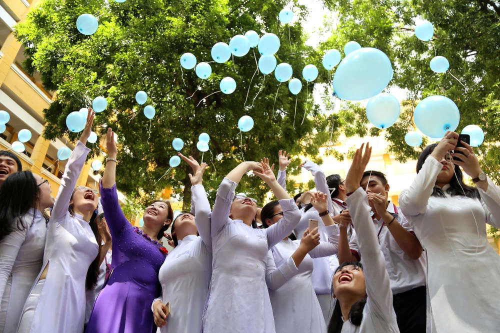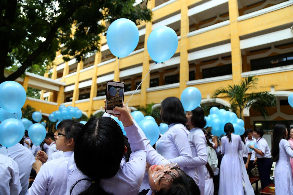 Nghi thức thả bong bóng mang theo điều ước của học sinh khối 12 đã trở thành thông lệ mỗi năm.