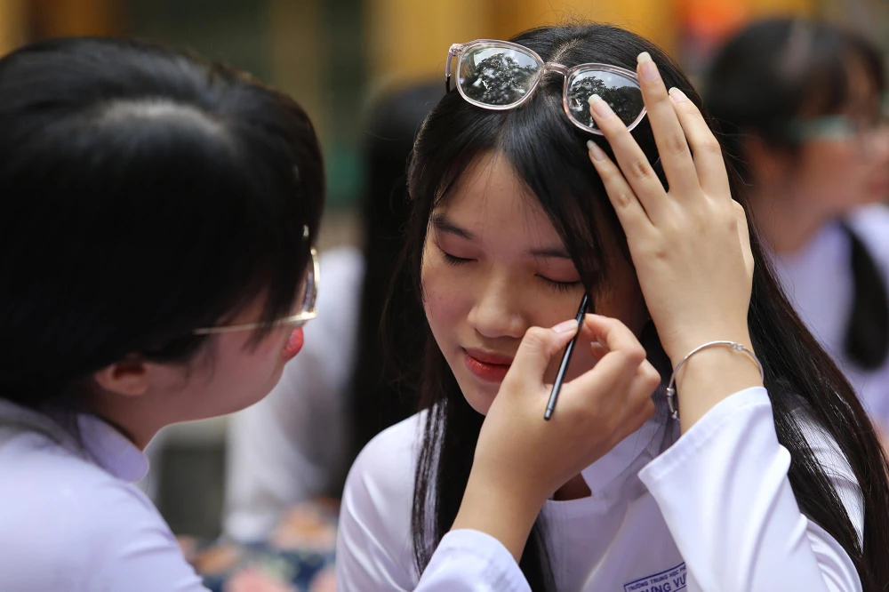 Từ 7 giờ sáng, sân trường đã rộn vang tiếng nhạc, toàn thể học sinh khối 12 trong trang phục chỉnh tề chuẩn bị làm lễ tri ân và trưởng thành.Trong ảnh: Hai nữ sinh giúp nhau trang điểm trước giờ buổi lễ diễn ra.