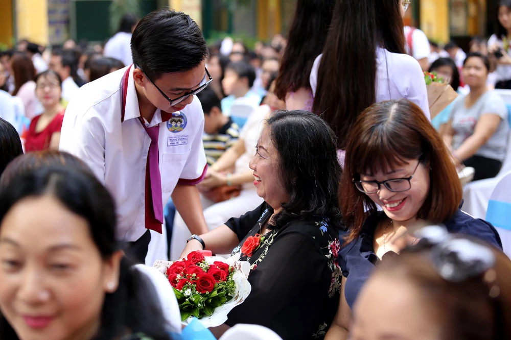 Những bó hoa tươi thắm các em học sinh dành tặng thầy cô.