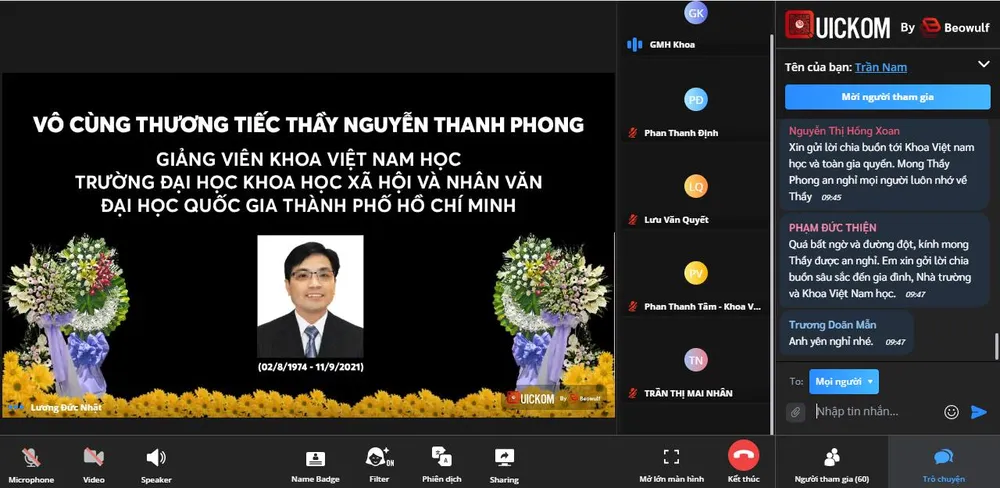 Th.S Trần Nam, Trưởng phòng truyền thông và Tổ chức Sự kiện của trường, cho biết đây là lần đầu tiên trường phải tổ chức một lễ truy điệu đặc biệt như vậy. Do điều kiện dịch bệnh phức tạp, hơn 300 người là cán bộ, giảng viên, sinh viên của trường từ nhiều nơi đã tham dự qua ứng dụng trực tuyến để tưởng nhớ về một đồng nghiệp, một người thầy.