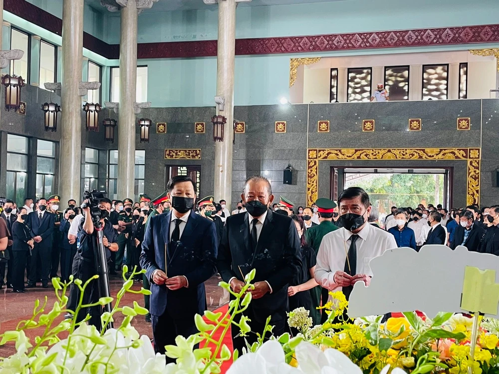 Nguyên Phó Thủ tướng Trương Hòa Bình, nguyên Chủ tịch UBND TP Nguyễn Thành Phong thắp hương tiễn biệt ông Lê Hòa Bình. Ảnh VIỆT HOA