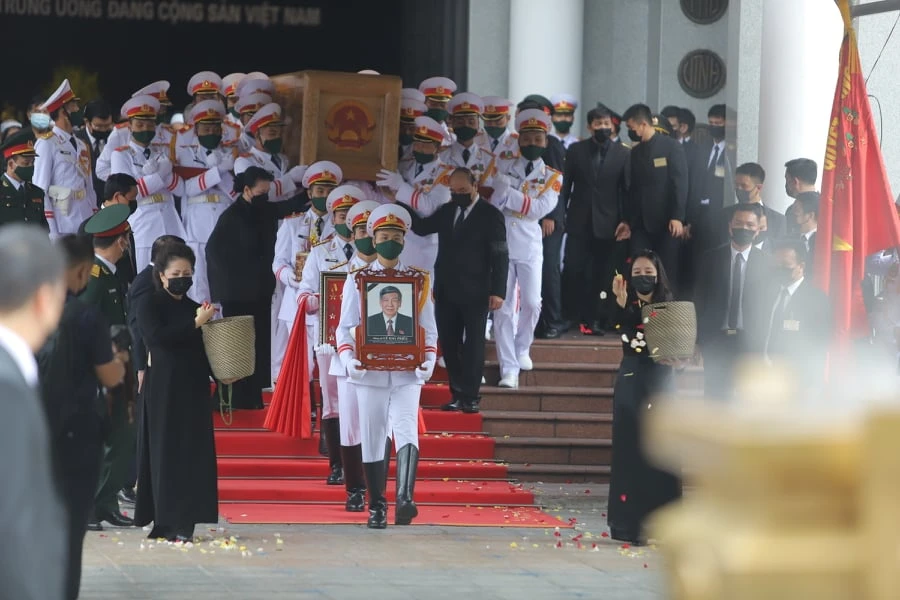 Lãnh đạo Đảng, Nhà nước và gia đình đưa linh cữu Nguyên Tổng Bí thư Lê Khả Phiêu ra cỗ linh xa.