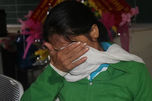 Mà Kim - mẹ của em Nguyễn Anh Tuấn òa khóc khi đến trường thay con nhận huân chương Dũng cảm.