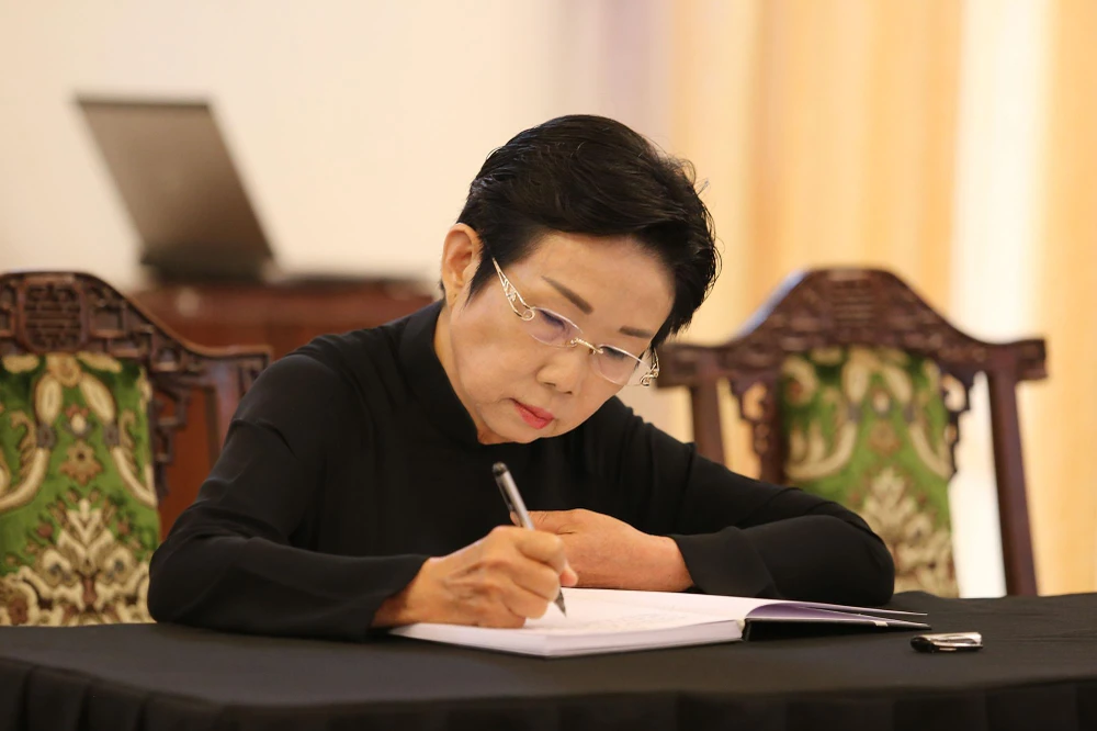 Bà Trương Thị Hiền, nguyên Giám đốc Học viện Cán bộ TP.HCM đến viếng và viết sổ tang chia buồn. Ảnh: HOÀNG GIANG.