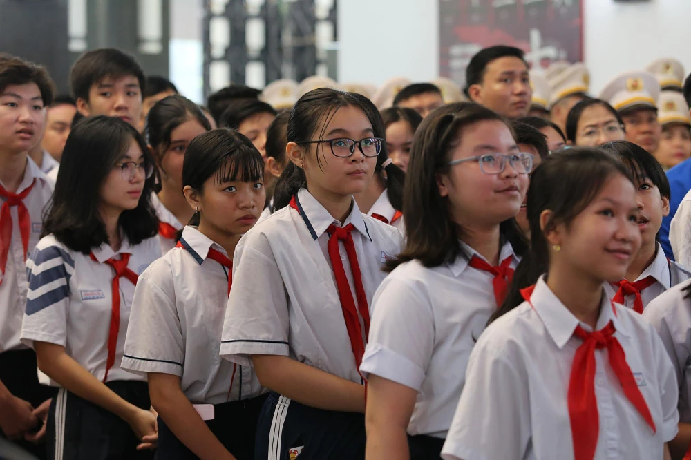 Các em học sinh trường THCS Nguyễn Du vào viếng Đại tướng Lê Đức Anh. Ảnh: HOÀNG GIANG