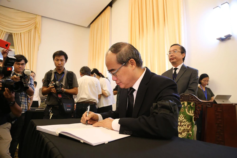 Bí thư Thành ủy Nguyễn Thiện Nhân ghi sổ tang. Ảnh: HOÀNG GIANG