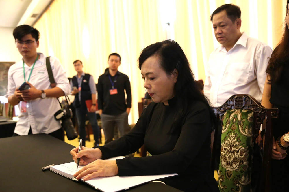 Bà Nguyễn Thị Kim Tiến, Bộ trưởng Bộ Y tế viết sổ tang. Ảnh: HOÀNG GIANG