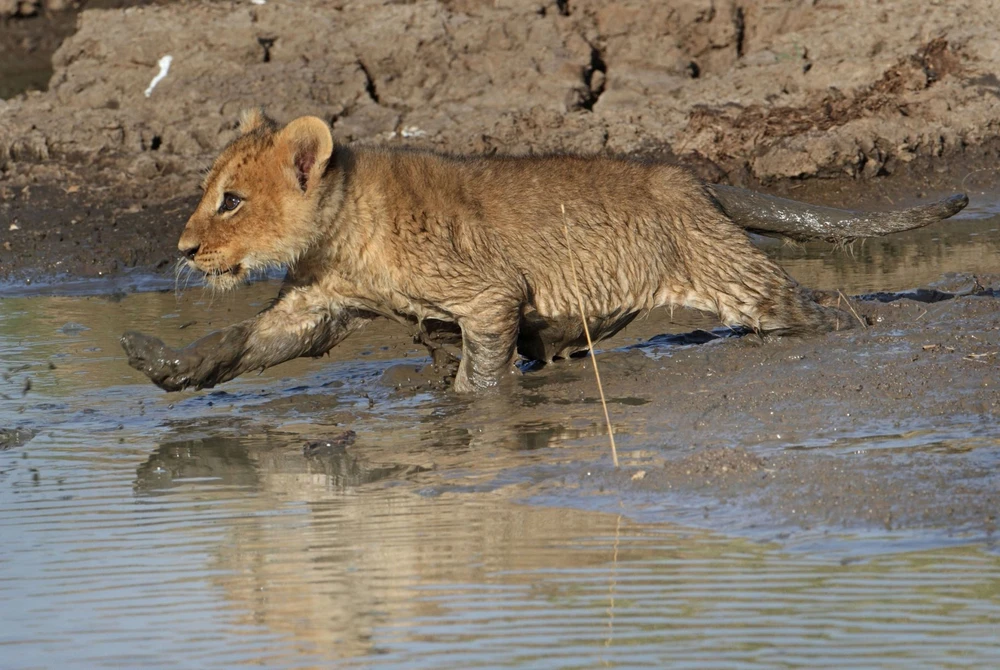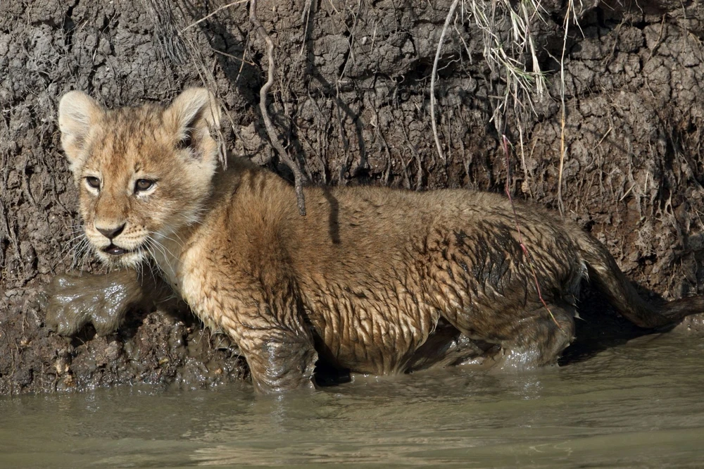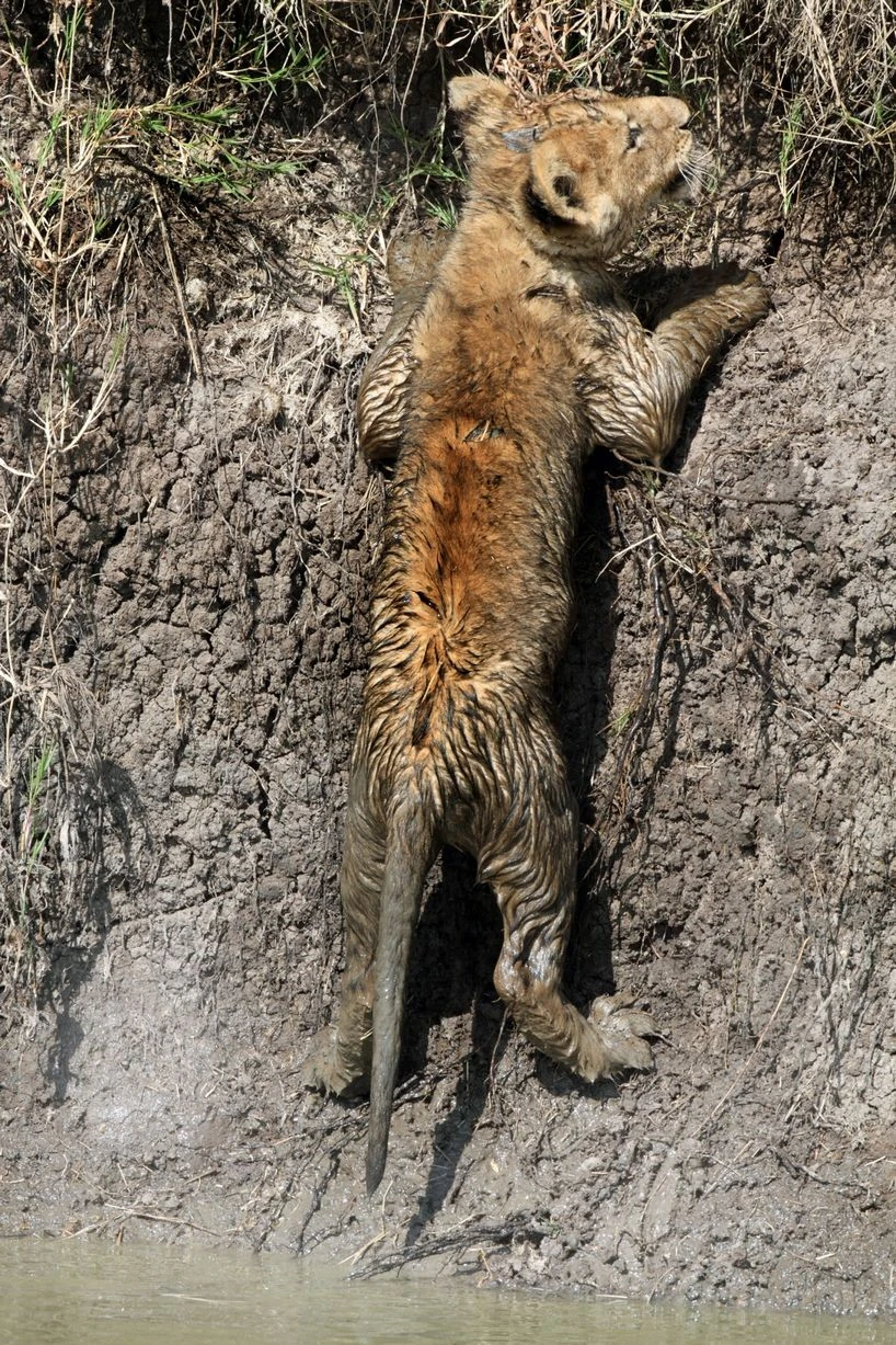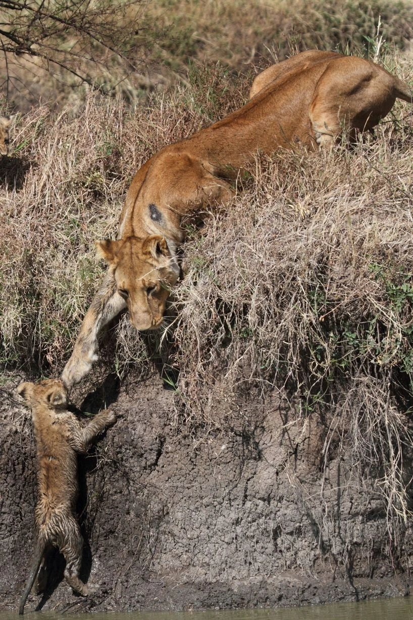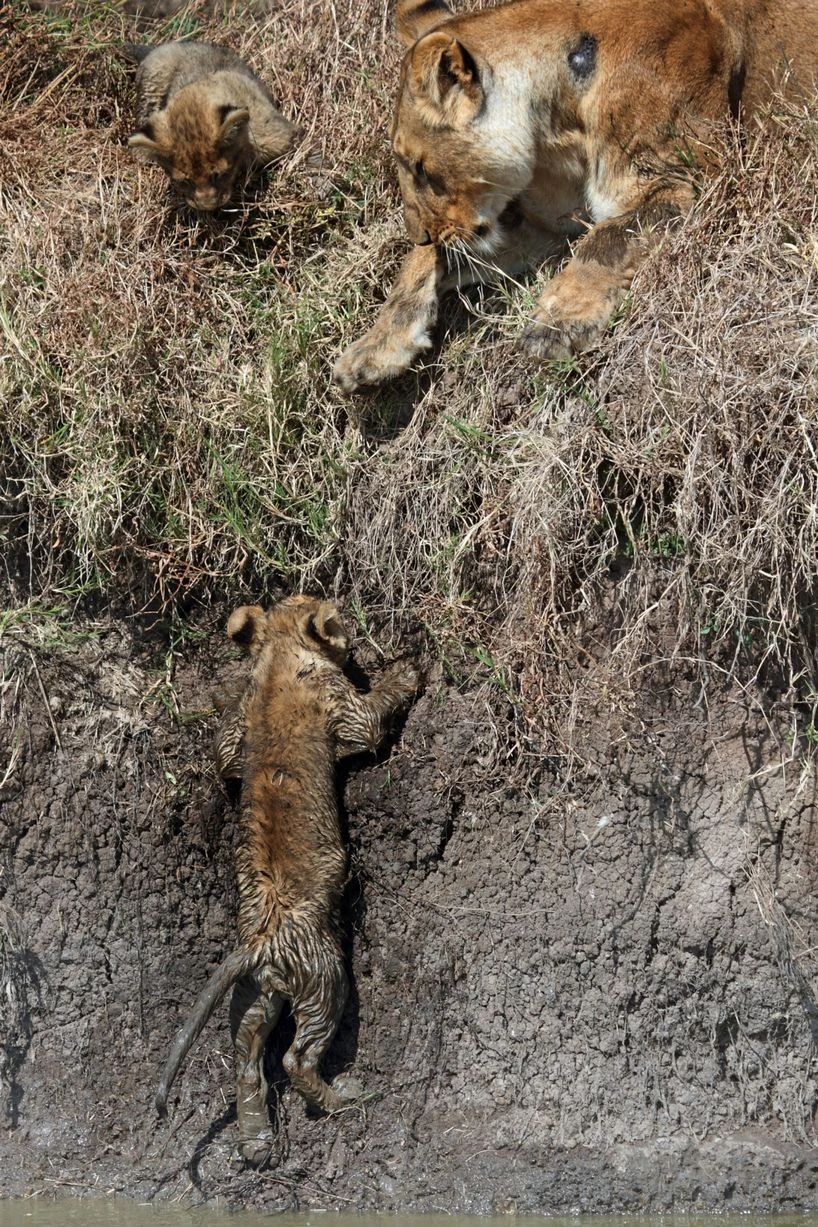 Phải vật lộn trong đống bùn lầy nhưng khi tới bờ bên kia, hai anh em sư tử không thể leo lên bờ. Sư tử mẹ kiên nhẫn để hướng dẫn con mình.