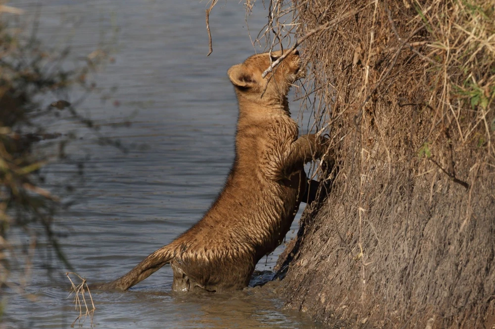 Bờ sông cao hơn nhiều so với sức bật của sư tử con