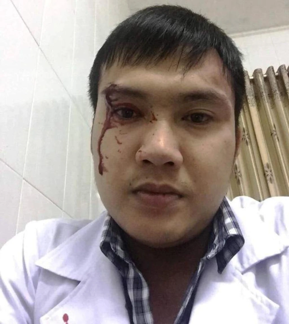 Thực tập sinh Trần Nhật Giáp (sinh viên năm sáu ĐH Y khoa Vinh, Nghệ An) bị đánh đổ máu, đã khâu ba mũi và đang theo dõi chấn động não.