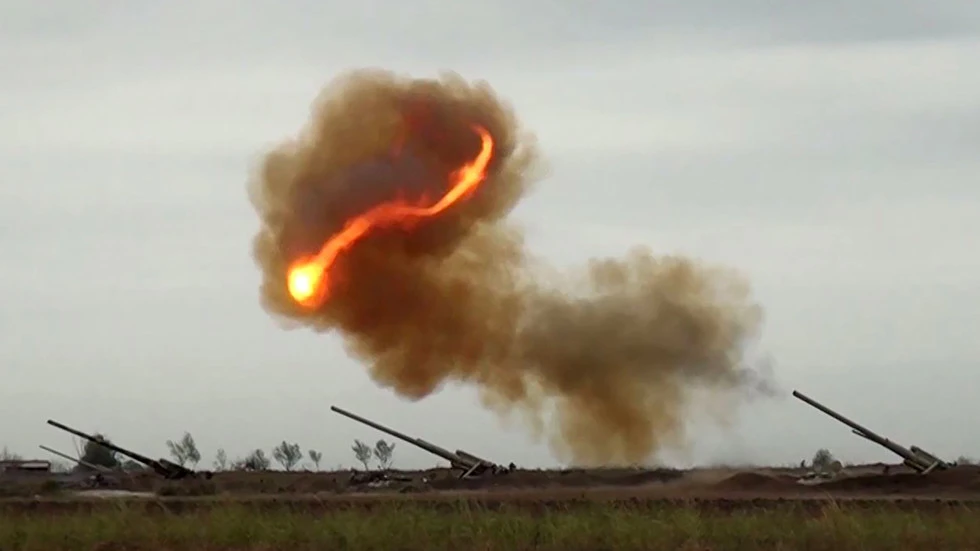 Một cuộc tấn công pháo binh của Azerbaijan ở khu vực tranh chấp Nagorno-Karabakh. Ảnh: Azerbaijani Defence Ministry/AFP