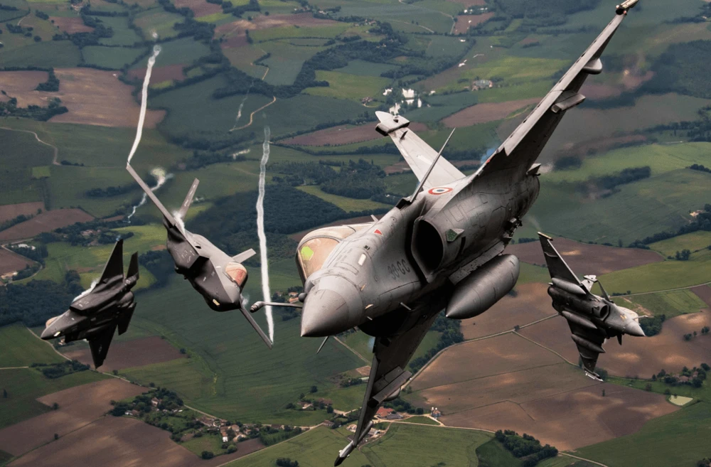 Hai máy bay tàng hình F-35A Lightning II của Không quân Mỹ và hai máy bay Rafale của Pháp bay qua Pháp hôm 18-5-2021 trong cuộc tập trận Atlantic Trident 21. Ảnh: US Air Force / Staff Sergeant Alexander Cook