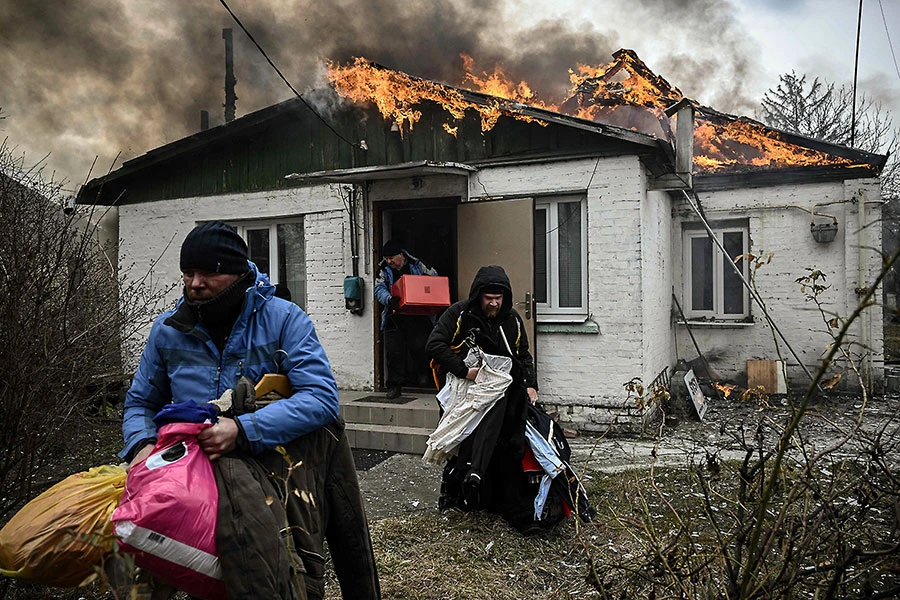 Người dân Ukraine tại TP Irpin gần thủ đô Kiev (Ukraine) gom hành lý
