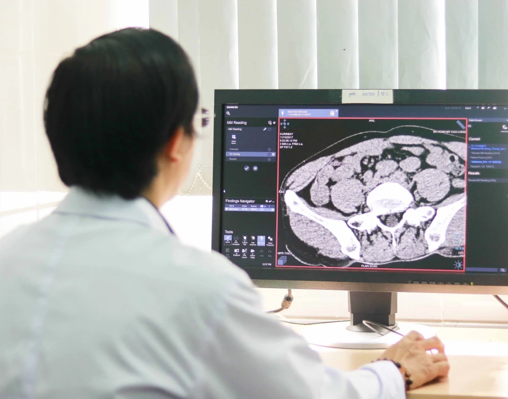 Kết quả chụp CT cho thấy ông Đ. bị xương cá đâm thủng ruột thừa. Ảnh: PHƯƠNG TRÀ