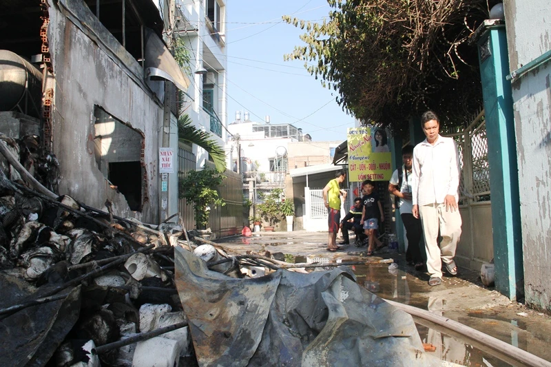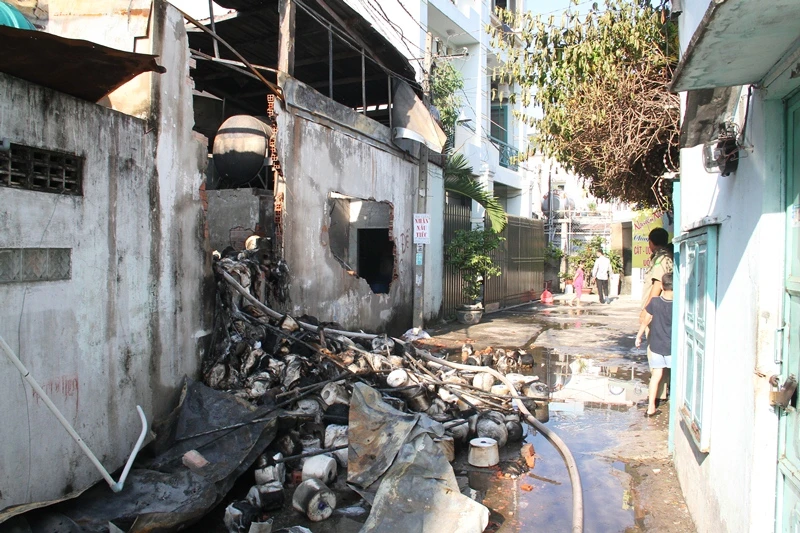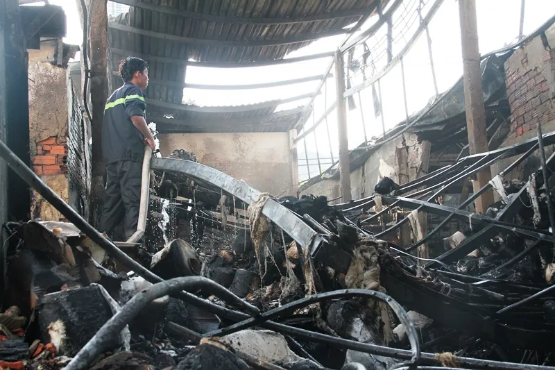 Theo quan sát, xưởng dệt chỉ có một lối ra khoảng 4 m, một bên là quán cà phê, một bên là tiệm tạp hóa; hai căn nhà liền kề cũng bị cháy xém.