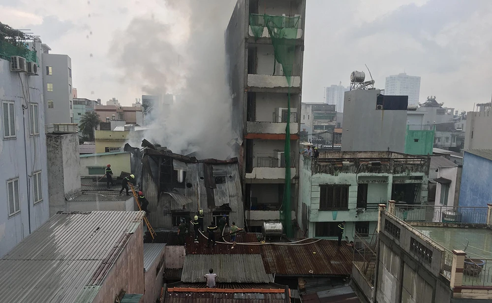 Hỏa hoạn bùng phát từ xưởng sản xuất giày trên đường Tôn Đản. Ảnh HT.