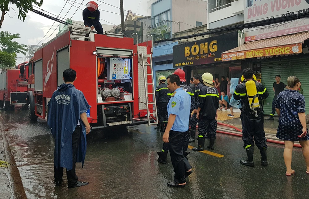 Cảnh sát PCCC quận 4 điều 4 xe cứu hoả cùng hàng chục cán bộ chiến sĩ tiếp cận hiện trường. Lính cứu hỏa leo lên mái nhà xung quanh, chia nhiều hướng tiếp cận điểm hỏa trong lúc trời mưa lớn.