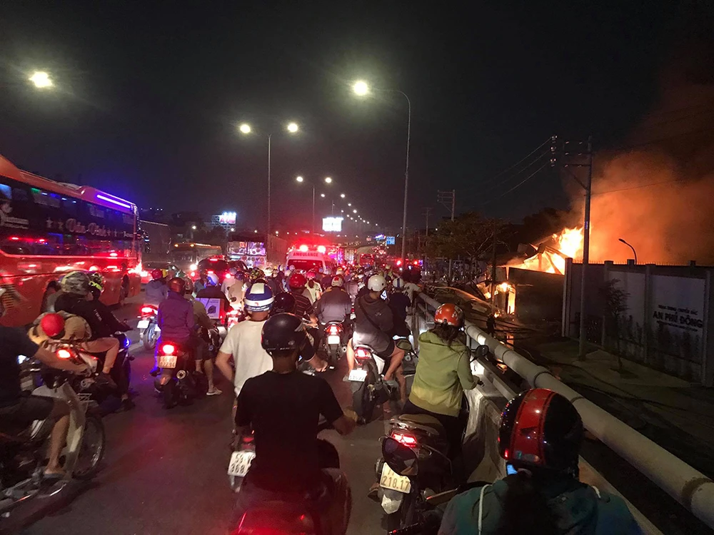Cột khói cùng lửa bốc cao hàng trăm mét, từ trên cầu vượt Bình Phước nhiều phương tiện giảm tốc độ khiến giao thông qua khu vực gặp khó khăn. Sức nóng từ đám cháy kèm khói bao trùm khu vực.