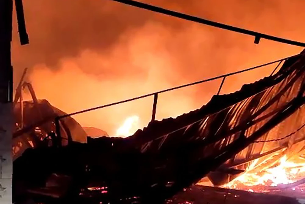 Đến hơn 22 giờ, đám cháy vẫn chưa được dập tắt. Ban đầu hỏa hoạn thiêu rụi cả ngàn mét vuông, khiến nhà xưởng đổ sập.