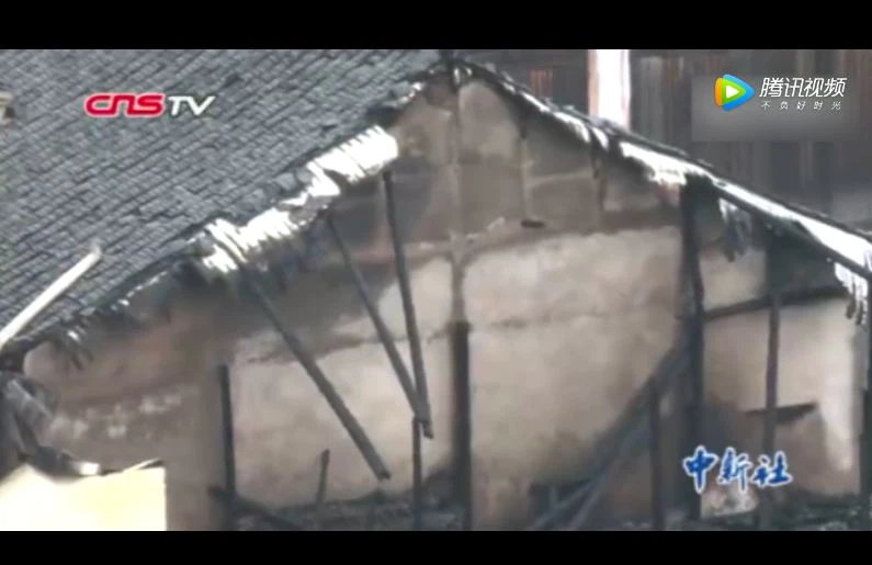 Một phần vách của một căn nhà xây theo kiến trúc cổ bị thiêu rụi. (Ảnh chụp màn hình video của CNSTV)