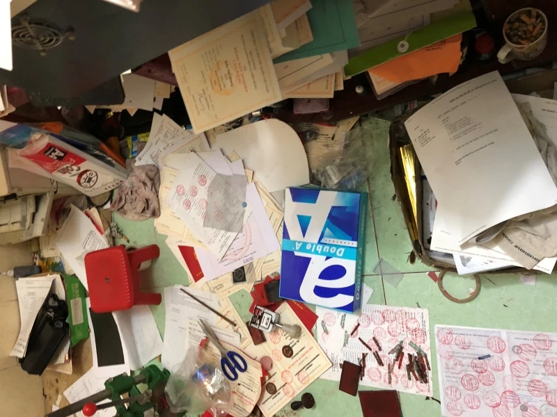 Tang vật cơ quan công an thu giữ gồm nhiều máy móc để sản xuất giấy tờ giả: máy in, máy dập, khoảng 1.600 mộc tròn, năm dập số thứ tự, hơn 10.000 phôi bằng, chứng chỉ các loại…