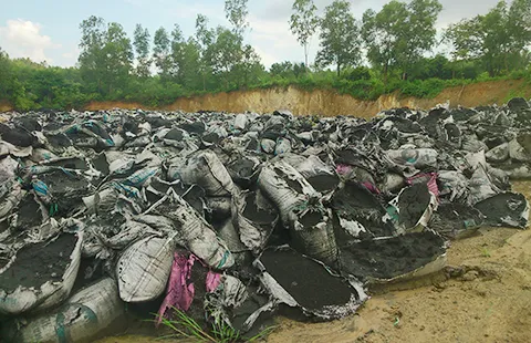 Ngoài những đống rác, chất thải tái chế còn chất thành từng đống lộ thiên gần khu nhà xưởng. Chất thải này được bỏ trong bao tải, có màu đen, được cho là than của nhựa cao su bị đốt, có mùi nồng khét, nhiều chỗ đã bị vùi lấp. Khi trời mưa, nước đen chảy loang ra khắp khu vực.