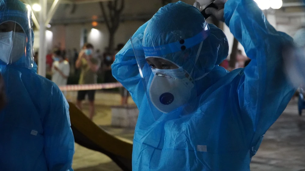 Nữ y tế mặc đồ bảo hộ tiếp tục lấy mẫu xuyên đêm. Ảnh: MINH TÂM