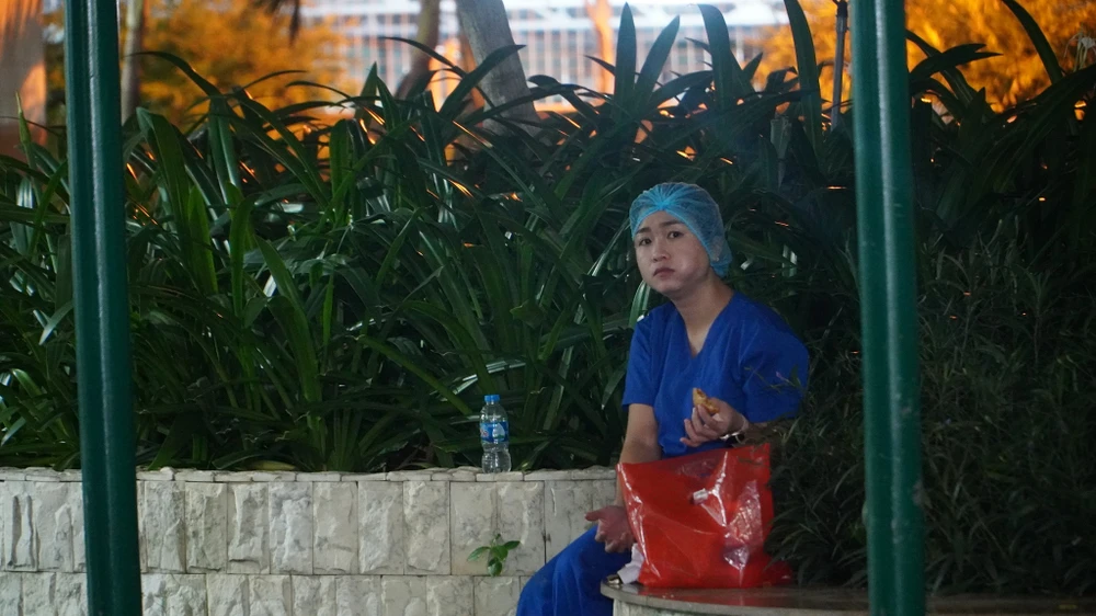 Một nhân viên y tế tranh thủ ngồi một góc ăn tạm ổ bánh mì để tiếp tục công việc. Ảnh: MINH TÂM