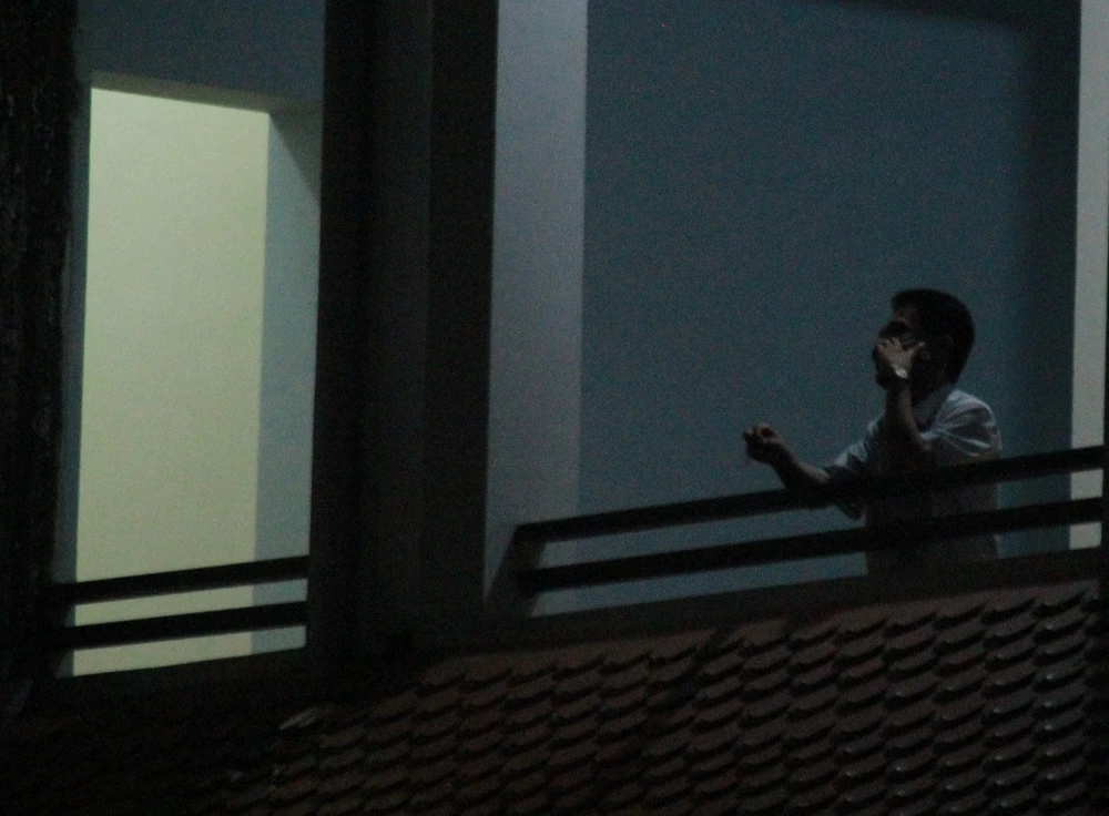 Phía dưới, một chiến sỹ liên tục đi kiểm tra khu vực sân ngoài trời cùng với đèn pin cầm tay