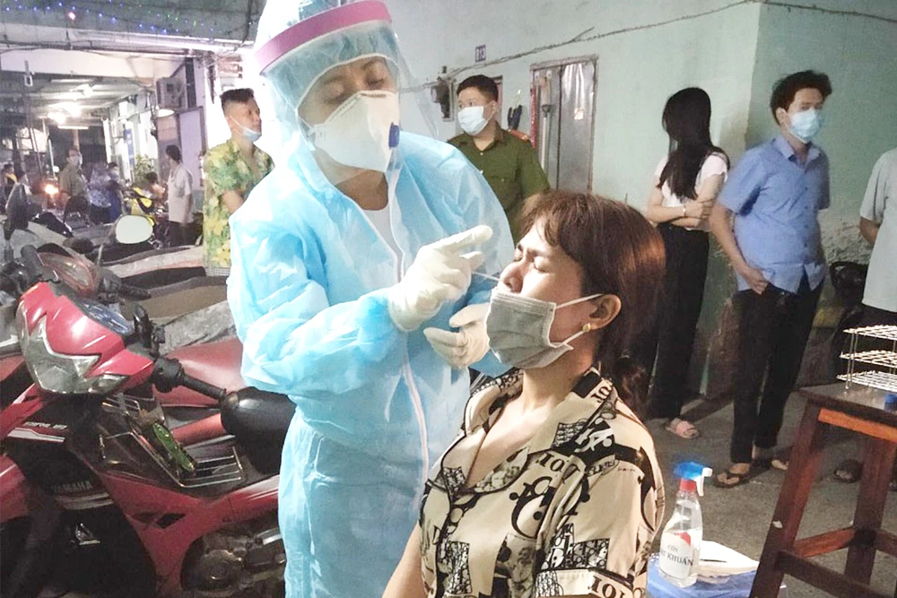 Nhân viên Trung tâm Y tế quận 11 đang lấy mẫu xét nghiệm cho người dân tại một khu trọ. Ảnh: SƯƠNG LINH