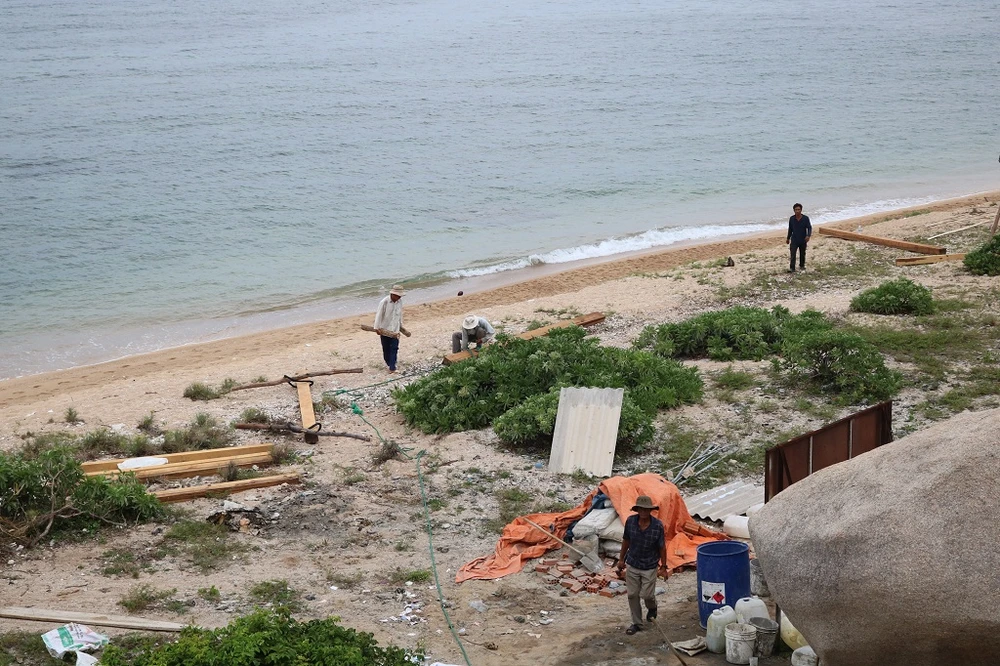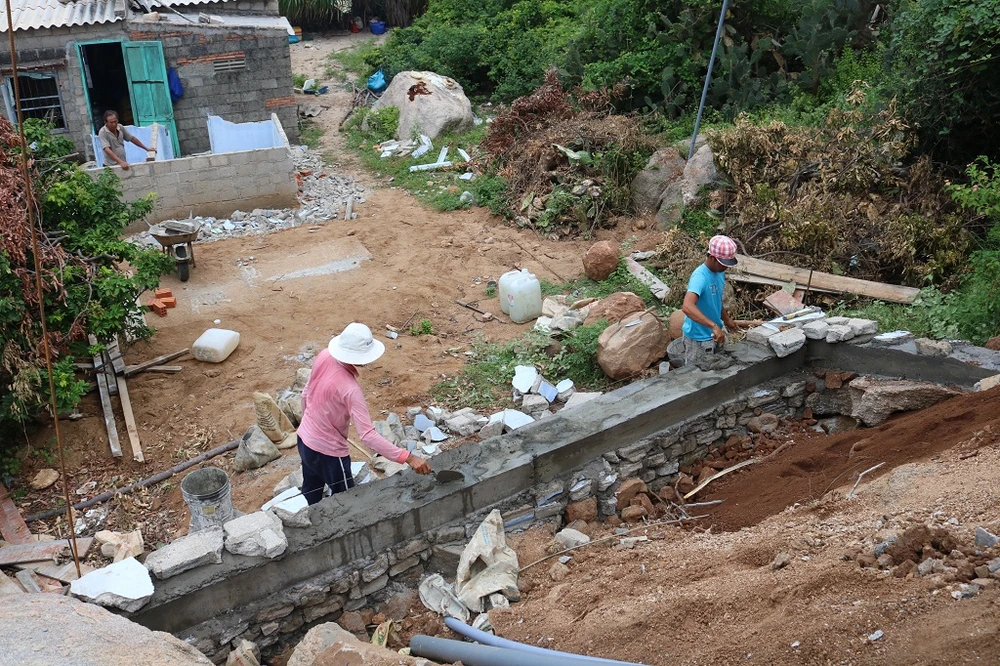 Anh Phùng Mỹ Trung (góc phải ảnh) thường xuyên ra đây để giám sát việc thực hiện công trình. Ảnh: LA HIÊN