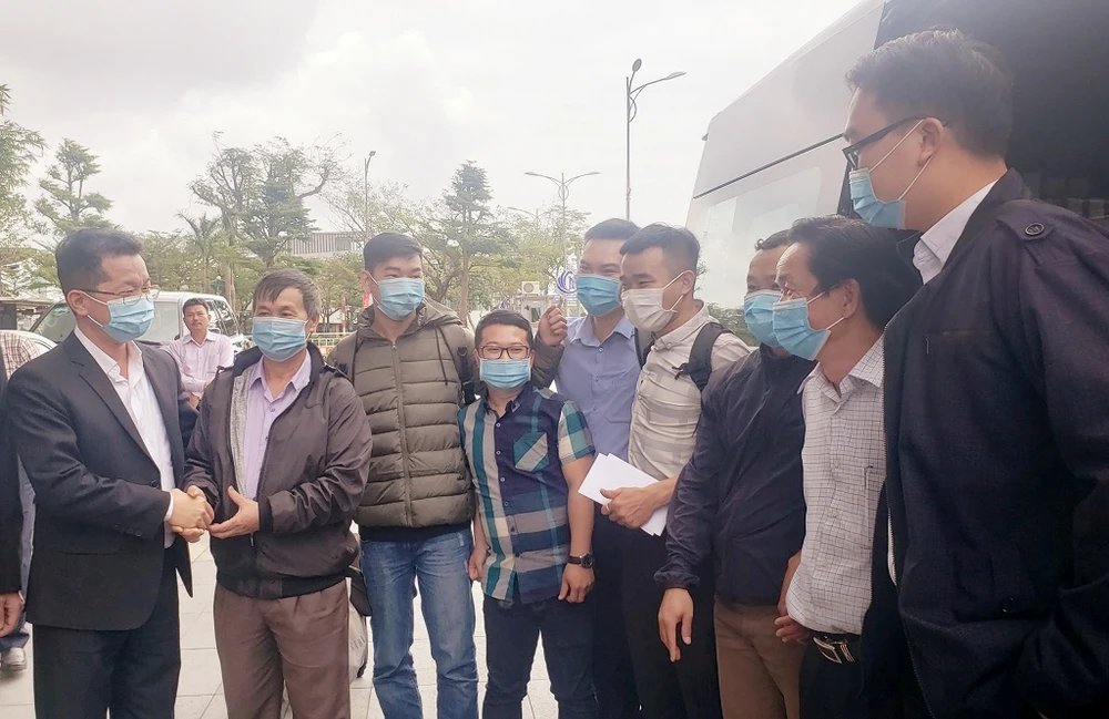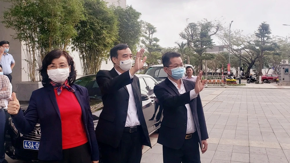 Bí thư Thành ủy Đà Nẵng Nguyễn Văn Quảng, Chủ tịch UBND TP Đà Nẵng Lê Trung Chinh và Giám đốc Sở Y tế Ngô Thị Kim Yến tiễn đoàn lên đường. Ảnh: T.AN