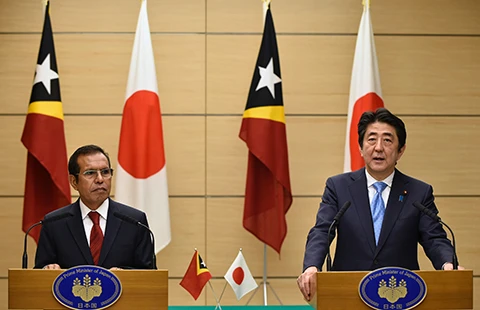 Thủ tướng Shinzo Abe (phải) và Tổng thống Đông Timor Taur Matan Ruak ngày 15-3 tại Tokyo. Ảnh: AFP/JIJI