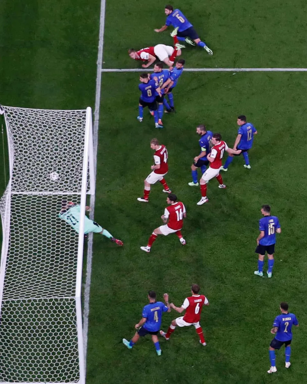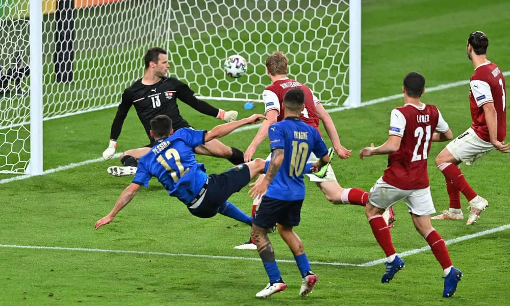 Đến những phút cuối của hiệp phụ thứ nhất, tuyển Ý xem như đặt một tay vào tấm vé vào chơi tứ kết Euro 2020 khi có được bàn thắng nhân đôi cách biệt. Acerbi té ngã trong vòng cấm nhưng vẫn cố gắng thực hiện đường chuyền cho Pessina dứt điểm chéo góc, nâng tỷ số lên 2-0 cho tuyển Ý.