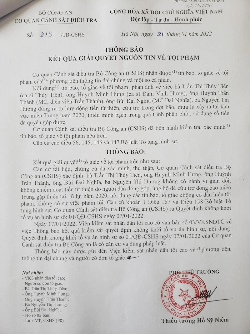 Văn bản Thông báo của Cơ quan Cảnh sát Điều tra Bộ Công an.
