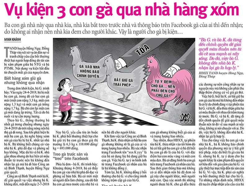 | Lập luận của TAND huyện Hồng Ngự Sau khi phát hiện bị mất ba con gà, bà G. nghe hàng xóm nói gà của bà bị bà K. nhốt tại nhà bà K. Do hai bên có mâu thuẫn từ trước nên bà G. không đến nhận lại gà mà bà đi báo công an, sau đó bà kiện đòi bà K. bồi thường giá trị ba con gà (693.000 đồng). Bà K. thừa nhận có giữ ba con gà vào nhà bà phá đồ đạc và phóng uế bừa bãi. Bà đã biết ba con gà đó là của bà G. Bà có mời một số người đến làm chứng, sau đó bà treo gà lên cây để “gà của ai thì người nấy đến nhận”. Bà còn đăng ảnh ba con gà lên Facebook để “tìm chủ nhân của gà”. Do lâu quá mà chủ gà không đến nhận nên bà đã cho số gà này cho ba người khác. Xử sơ thẩm, TAND huyện Hồng Ngự, Đồng Tháp cho rằng việc bà G. biết bà K. có bắt giữ ba con gà của bà mà bà không đến nhận là có lý do chính đáng, vì hai bà có mâu thuẫn trầm trọng từ trước. Việc ba con gà vào nhà bà K., bà K. không báo chính quyền địa phương mà tự ý bắt giữ trái phép. Mặc dù biết là gà của bà G. mà bà K. tự ý đem cho người khác là xâm phạm đến quyền sở hữu đối với gia cầm của bà G. và gây thiệt hại trực tiếp đến tài sản của bà G. Vì vậy, tòa tuyên buộc bà K. phải bồi thường 693.000 đồng cho bà G. Người có lỗi phải bồi thường Có thiệt hại thực tế, có mối quan hệ nhân quả giữa hành vi giữ gà của bà K. và hậu quả mất gà của bà G. thì người có lỗi là bà K. phải bồi thường. Giá và trọng lượng hai bên có thể thống nhất, nguyên tắc tự thỏa thuận về giá trị tài sản. Bà K. biết rõ gà là của bà G. thì lùa ra khỏi cổng chứ sao giữ lại treo lên, đăng lên Facebook. Mà không biết Facebook của bà có mấy bạn bè, có ai xem không, có ai theo dõi không. Nếu Facebook ít người xem thì thông báo có công khai thì cũng như kín. Theo tôi, tòa xử vậy là đúng. Anh NGUYỄN HỒNG, quận 11, TP.HCM |